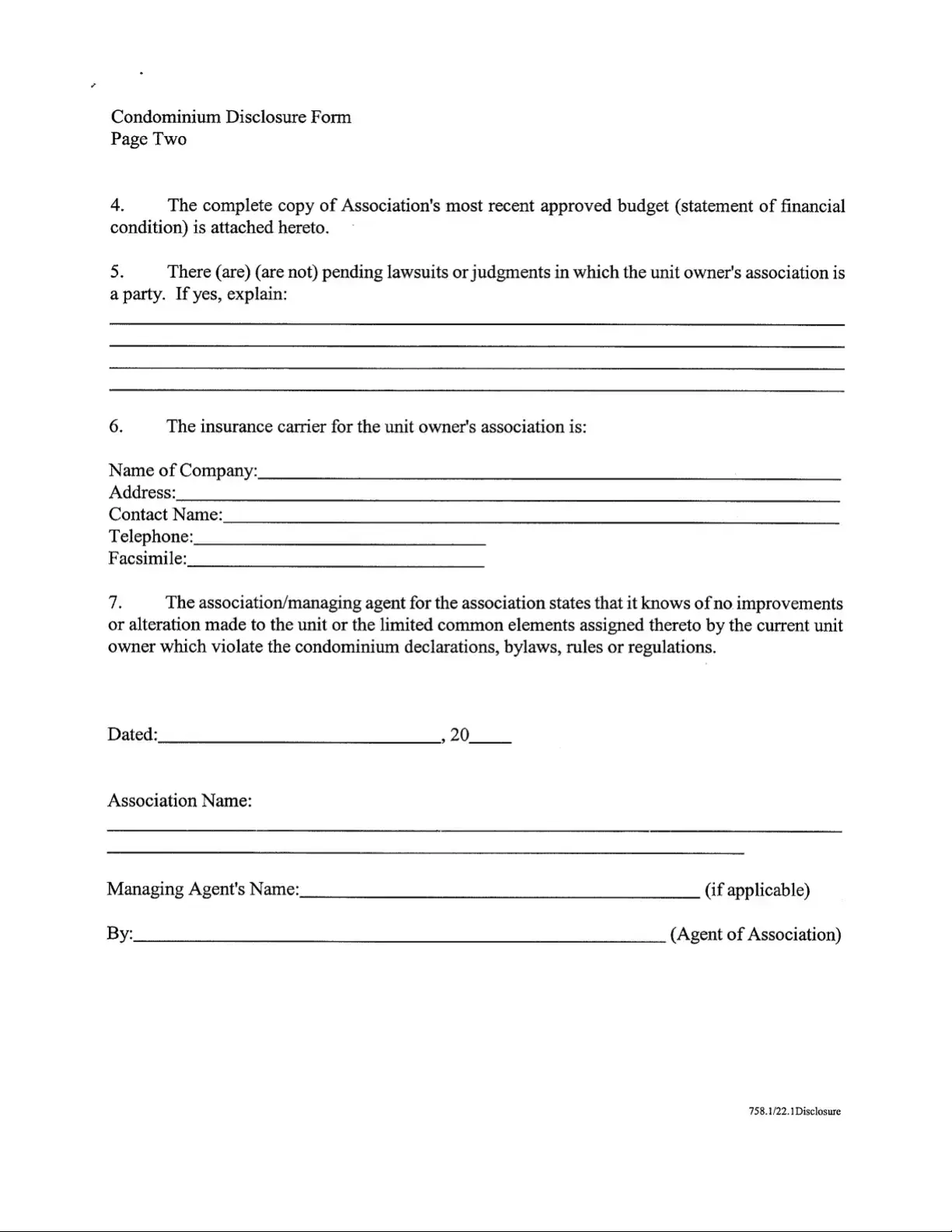 - Provide the name and address of the insurance carrier for the unit owner's association, along with the contact name, telephone number, and facsimile number.