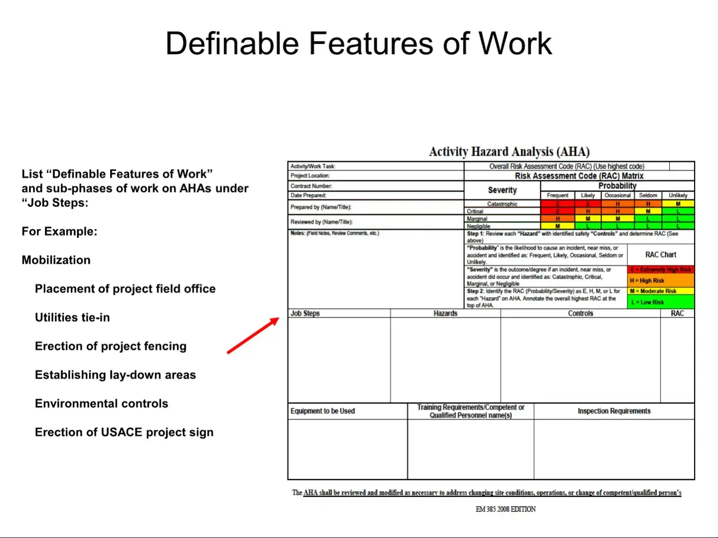 To complete the AHA EM 385 form, start by identifying the specific work tasks involved in your project. Next, review each potential hazard associated with those tasks and determine the appropriate safety controls. Use the Risk Assessment Code (RAC) matrix to evaluate both the probability of an incident occurring and the severity of its consequences. This will help you assign a RAC to each hazard. Finally, ensure that the AHA is reviewed by a qualified person and discussed with all team members before work begins. Remember, this form is dynamic and should be updated as conditions change.