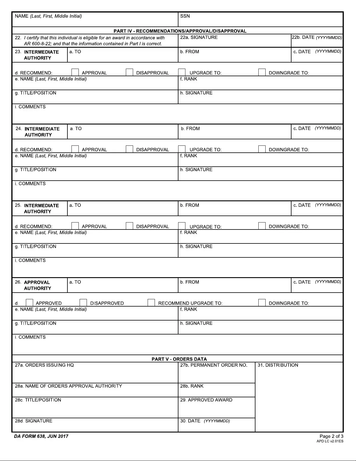 After submission, the form undergoes a review process. Intermediate authorities evaluate the recommendation and either approve or disapprove it. The final decision is made by an approval authority, who will then issue orders for the award if approved.