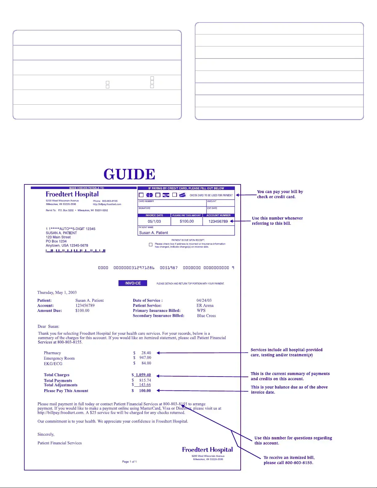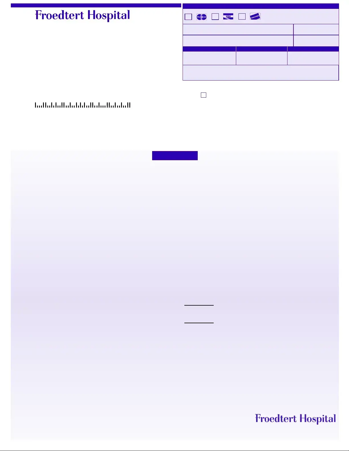 Patients have multiple options for making payments. Payments can be made by mailing a check to the address provided on the form. For those preferring electronic payment, the hospital offers an online payment option through their website, where payments can be made using MasterCard, Visa, or Discover. Additionally, patients can contact Patient Financial Services at 800-803-8155 to discuss payment arrangements.